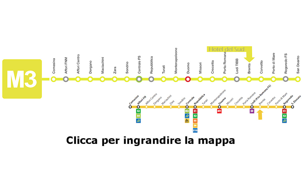 Dalla Stazione Centrale, raggiungere il nostro hotel è molto semplice. Vi basterà prendere la metropolitana 3 (Linea Gialla) direzione San Donato e scendere dopo 9 fermate a Brenta. Da qui, percorrendo per 30 metri Corso Lodi, troverete l´Hotel al n.74.